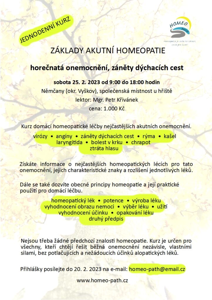 Homeopatická pomoc při akutních onemocněních, jako jsou např. záněty dýchacích cest, zažívací problémy, rekonvalescence poúrazových stavů apod. Je možné a někdy i nezbytné akutní konzultaci udělat na dálku, po telefonu.